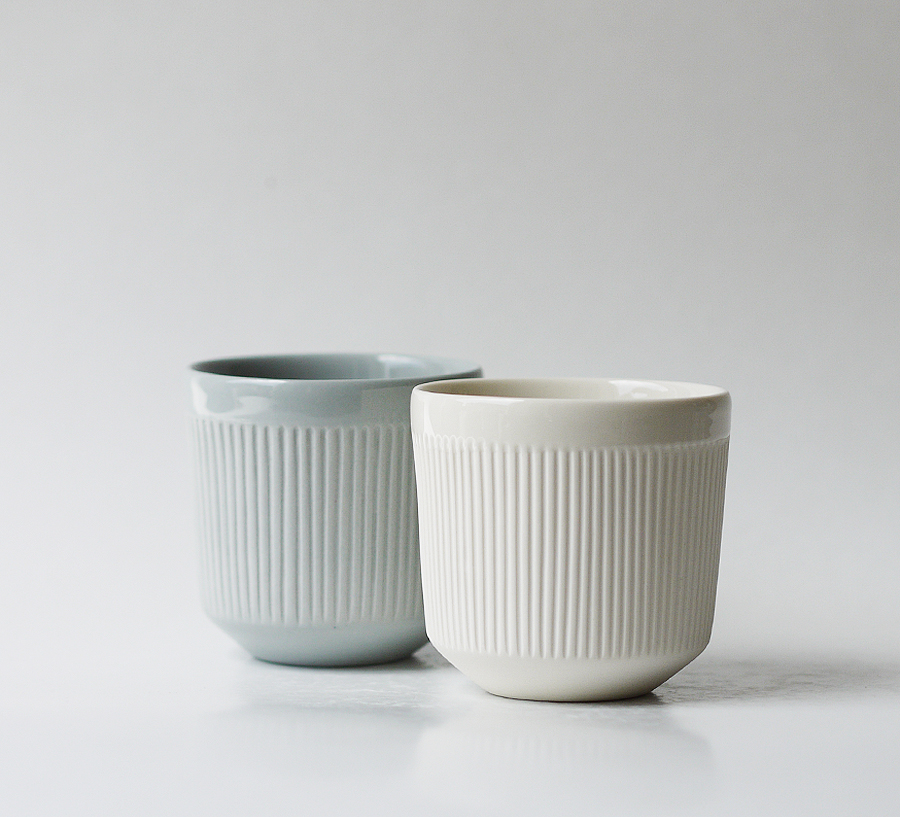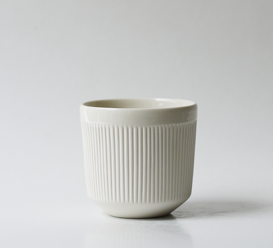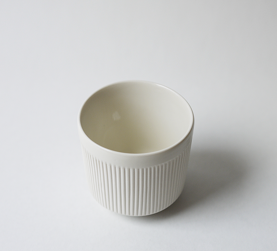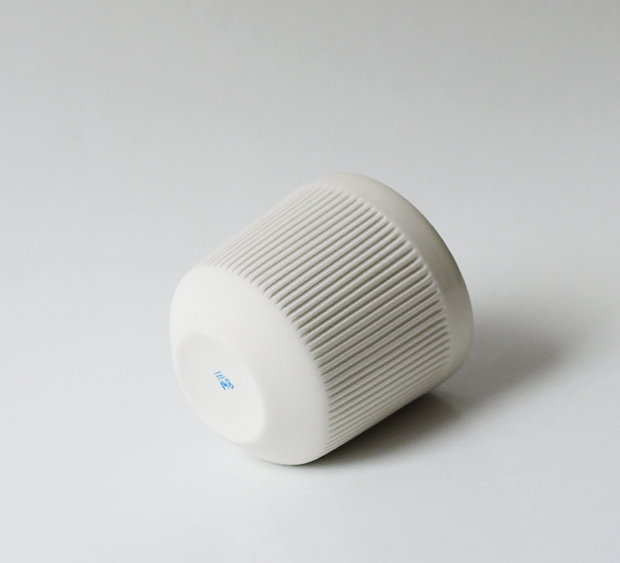 Made of porcelain this cup is carefully hand crafted. It’s ridged surface is very pleasant to the touch. It is coated inside and on its rim with glossy transparent glaze and the exterior is left matte.